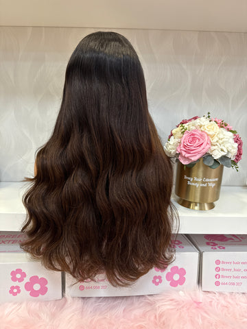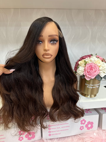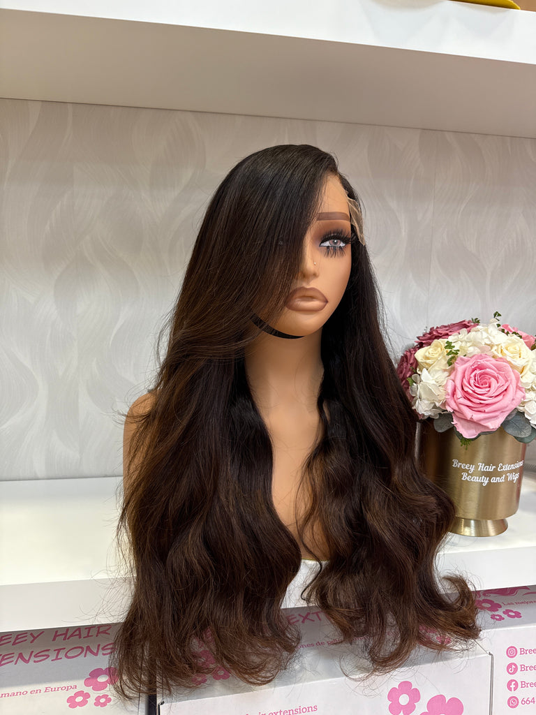 Una hermosa peluca con colores miel ondulada cabello premium .