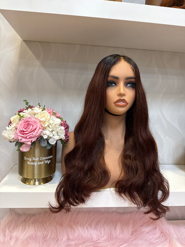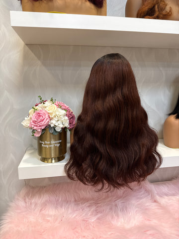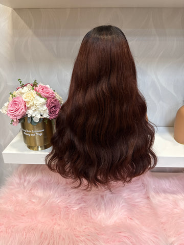 Peluca 100% humana y natural , confeccionada por Breey en nuestro centro , encaje frontal full HD invisible o indetectable , 55 cm de largo , falso crecimiento realizado color rojo cobrizo , en tendencia y moda , gorro tallas S ideal .