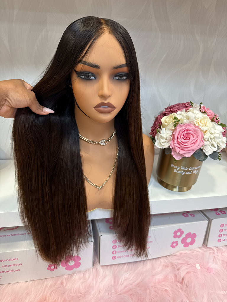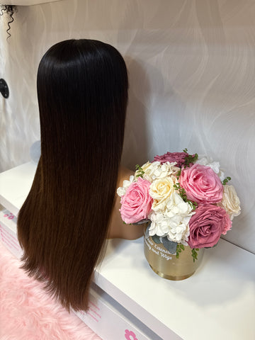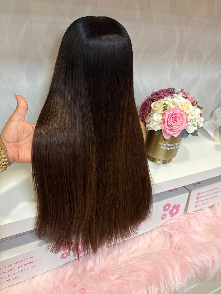 Peluca 100% humana y natural con balayague color chocolate y raíz castaña :